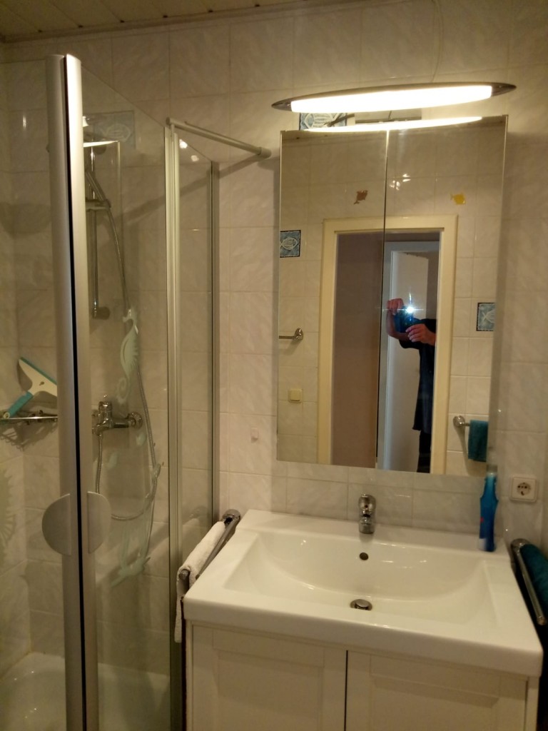 Offene Küche: komplett ausgestattet; E-Herd, Backofen, Mikrowelle, Kühl-/Gefrierkombination, Spülmaschine, Kaffeemaschine, Toaster, Wasserkocher, Bügel-Set usw.