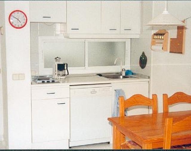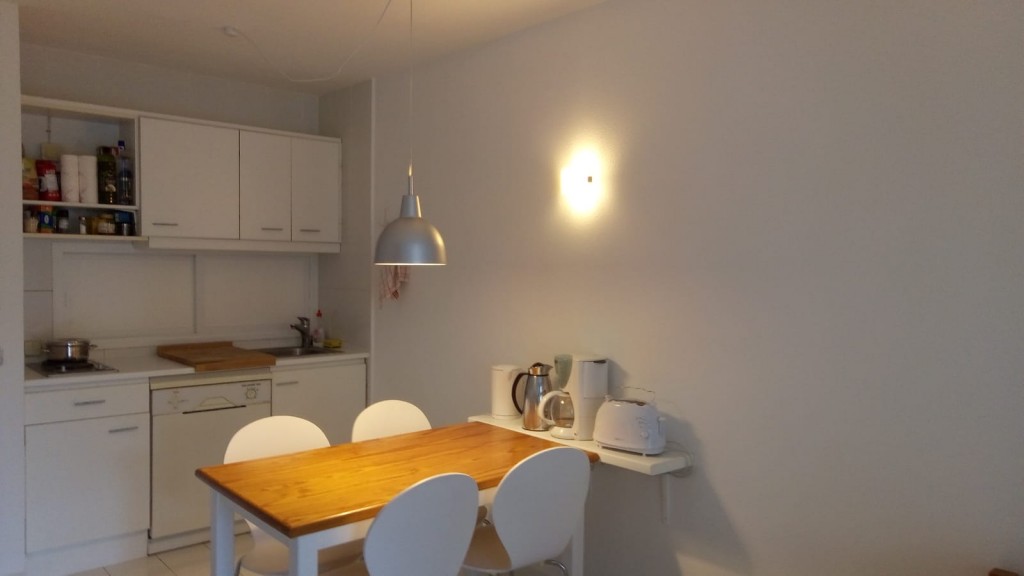 Offene Küche: Küchenzeile mit Spülmaschine, Kaffeemaschine, Kühlschrank