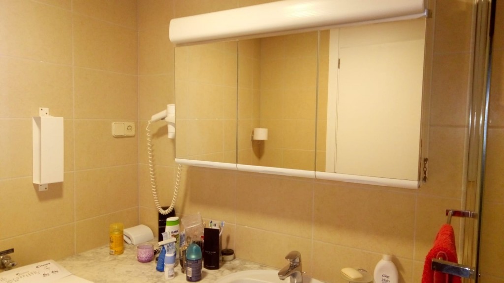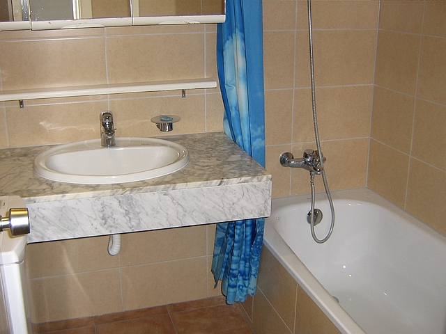 1 Badezimmer mit WC und Duschwanne, Haarfön, Waschmaschine