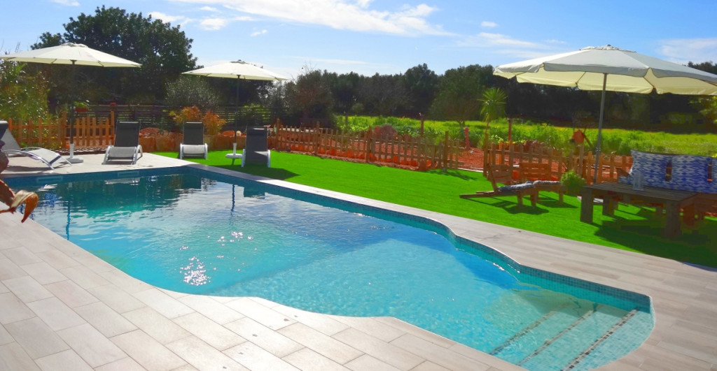 Außenbereich: teilweise überdachte Terrassen, Gartenmöbel, angelegter Garten, Sonnenliegen, Sonnenschirm, Pool, BBQ, Kfz-Stellplatz