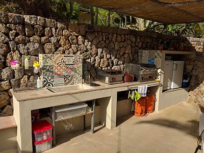 Außenbereich: gepflasterte Veranda, Terrasse, Garten, Gartenmöbel, Liegestühle, Sonnenschirme, Holzterrasse um den Pool herum, Außenküche, Weber-Gasgrill im Sommer, Holzgrill in der Nebensaison, Außendusche, Tischtennisplatte, Kfz-Stellplatz